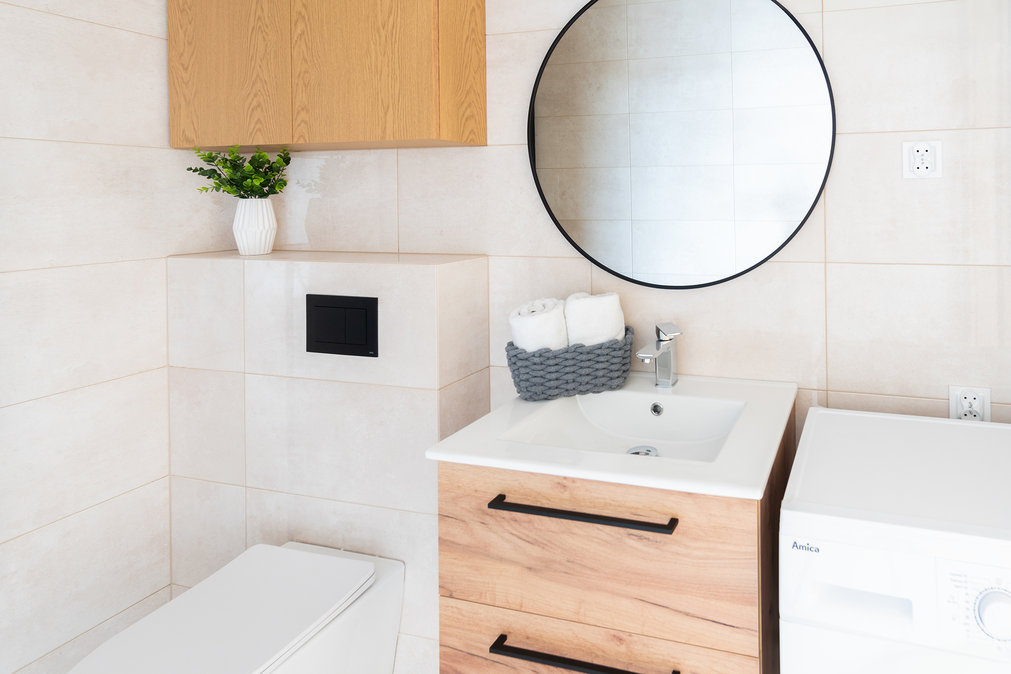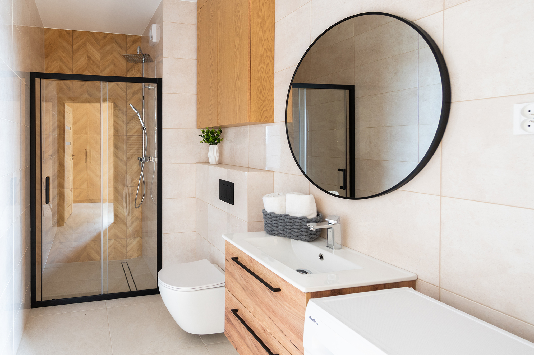 pralka, prysznic, umywalka, lustro, grzejnik łazienkowy