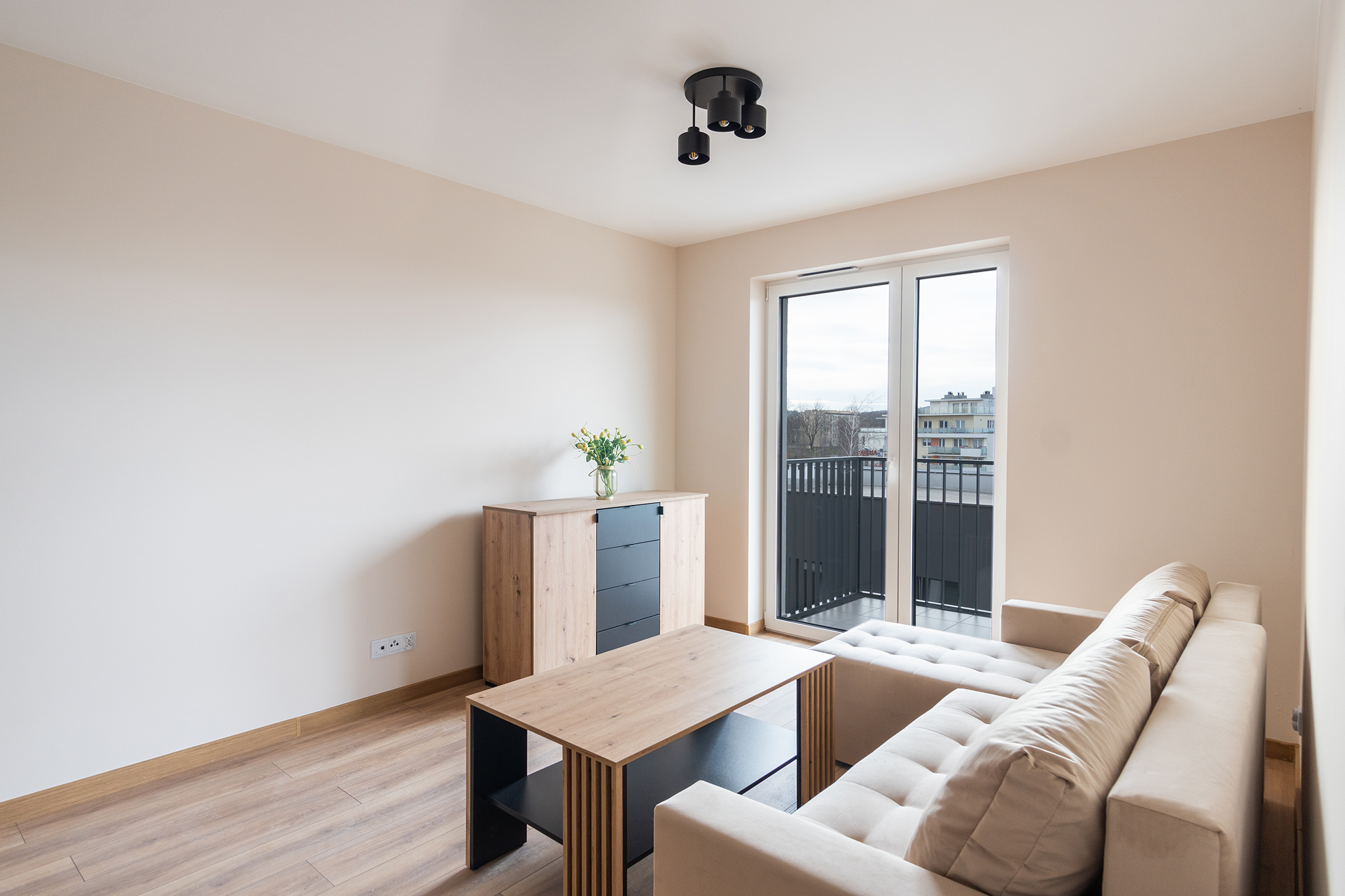 Mieszkanie w pełni umeblowane i wyposażone w najpotrzebniejsze sprzęty, położone na czwartym piętrze nowego budynku z 2024 r z dużymi balkonami na które można wyjść z salonu i sypialni.