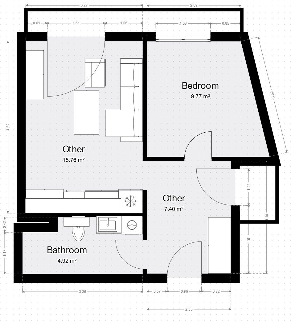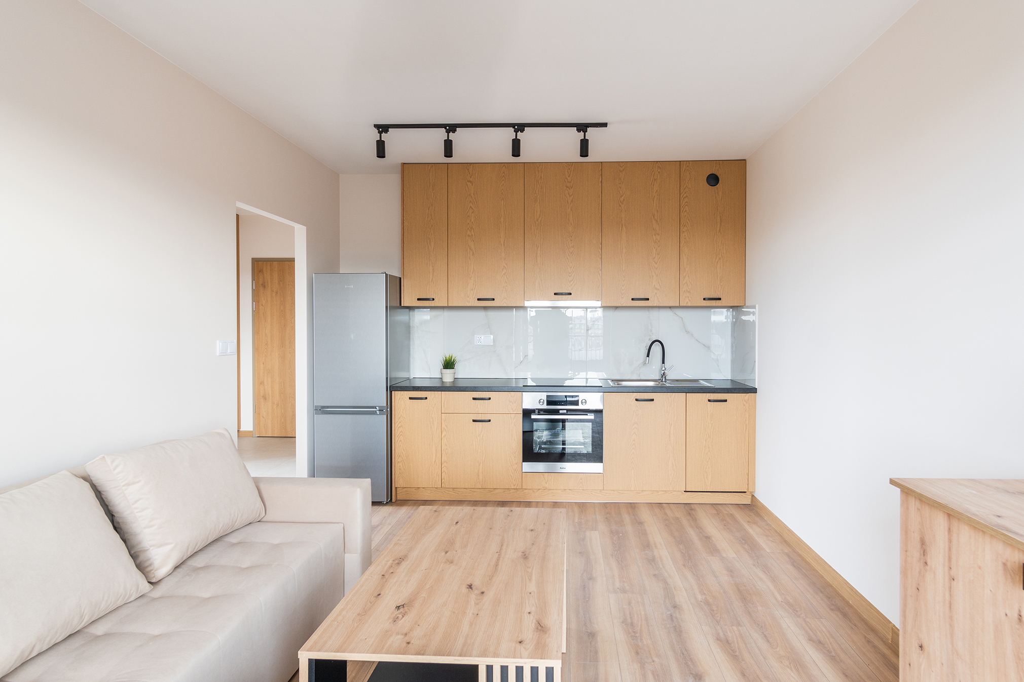 Mieszkanie składa się z sypialni, zapewniając osobną przestrzeń do wypoczynku dla domowników. Otwarta przestrzeń wnętrza łączy w sobie salon z kuchnią, co sprzyja integracji i wspólnym chwilom spędzonym z bliskimi.